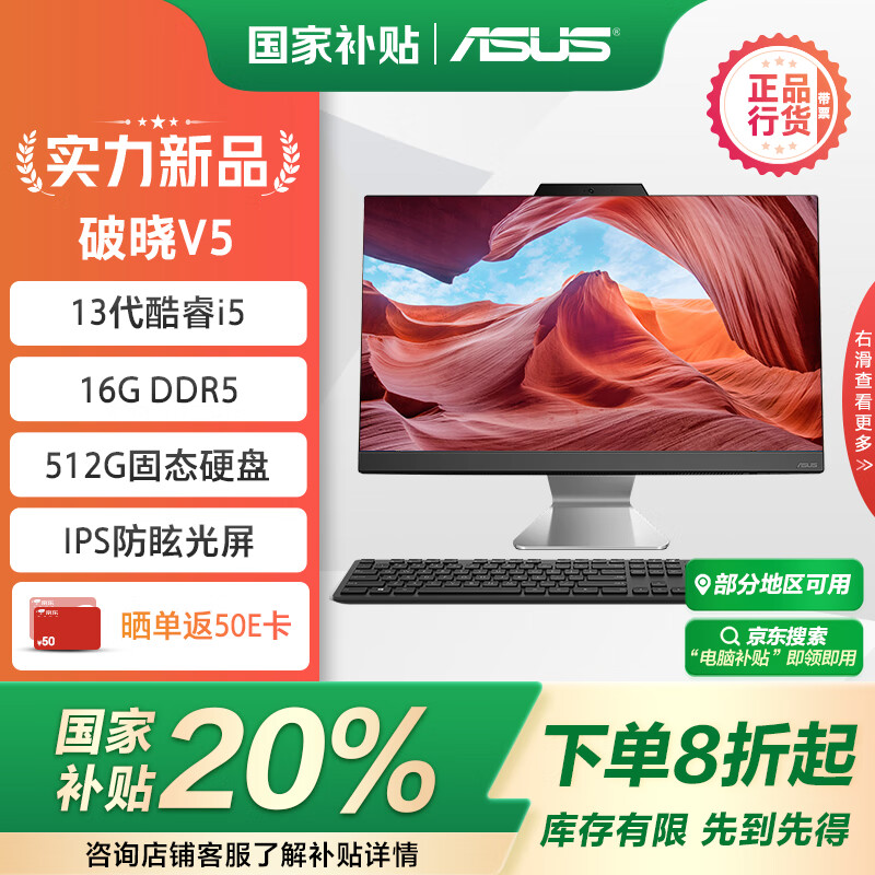 华硕破晓V5 2024 23.8英寸一体机台式电脑 补贴(13代i5-1335U 16G DDR5 512G SSD WiFi6 蓝牙)黑价格:3999.00元!