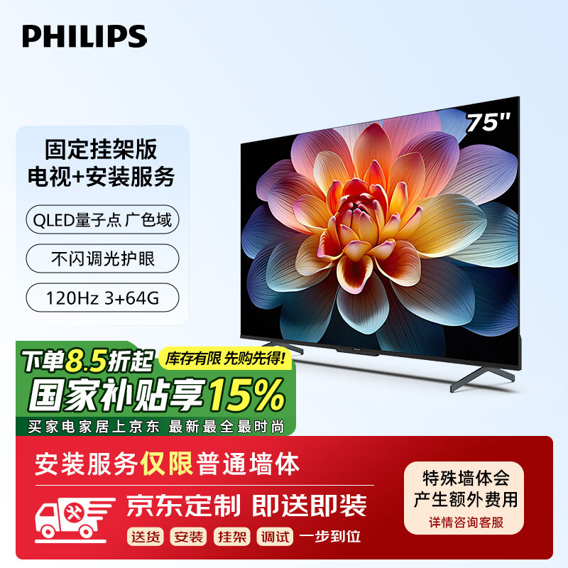 飞利浦(PHILIPS)8599系列75英寸【包安装版-固定挂架送装一体】4K超高清QLED 120Hz液晶平板电视机 75PQF8599/T3价格:4198.00元!
