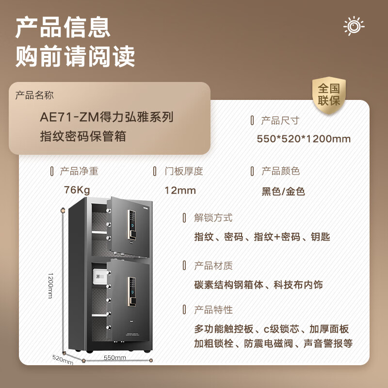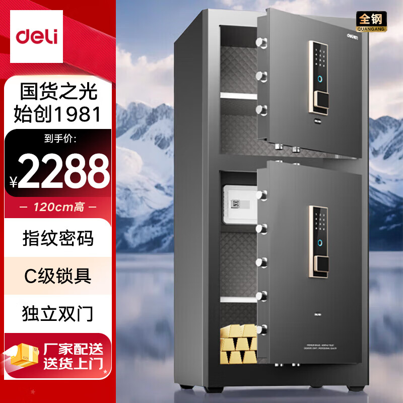 得力保险柜 家用办公指纹密码保险箱 大型双门保管柜 科技布内饰 120CM黑色 弘雅AE71-ZM价格:2288.00元!