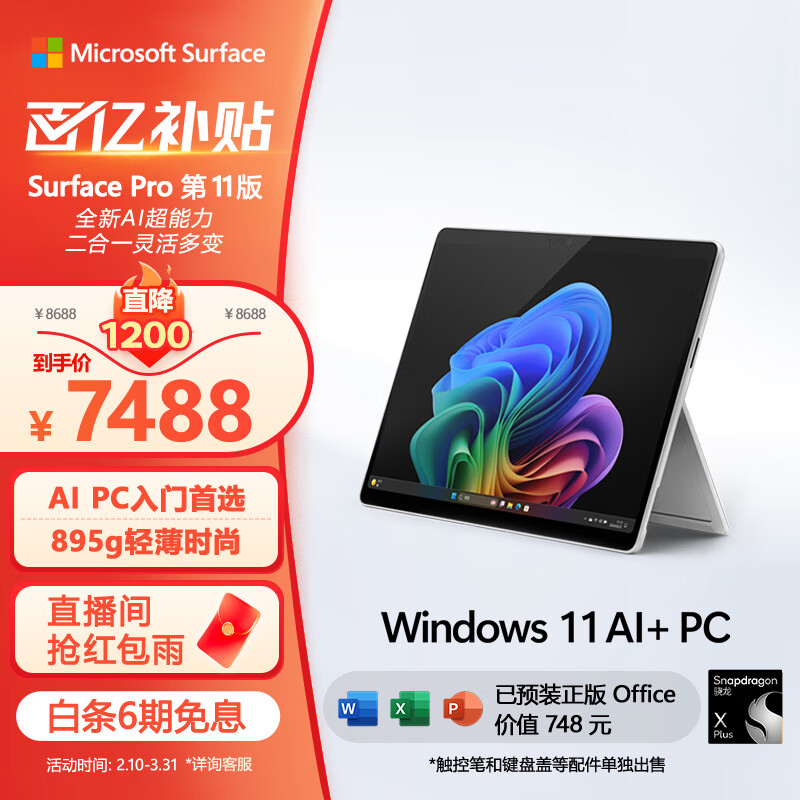微软(Microsoft)全新Surface Pro第11版 二合一平板电脑笔记本学生平板 AIPC Pro 11骁龙X Plus 16G+256G 亮铂金价格:7488.00元!