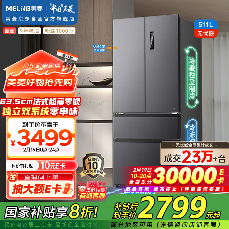 美菱(MeiLing)511升法式多门四开门超薄零嵌入式冰箱家用双系统大容量无霜变频一级BCD-511WP9CZX灰补贴价格:3999.00元!