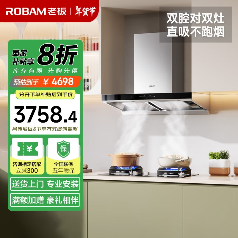 老板(Robam)抽油烟机欧式顶吸双腔变频烟灶套装25大吸力烟机家用燃气灶灶具智能挥手65D3S套装(天然气)价格:4553.00元!