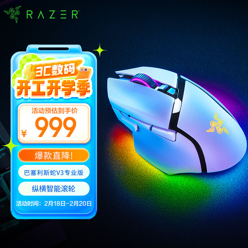 雷蛇(Razer)巴塞利斯蛇V3专业版无线鼠标 人体工学设计 RGB幻彩灯效鼠标 吃鸡/LOL/CS GO游戏 白色价格:999.00元!