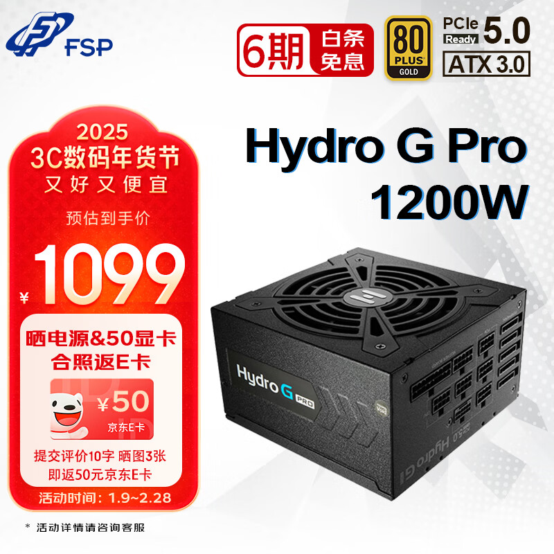 全汉(FSP)额定1200W Hydro G Pro1200W 金牌全模组电源(ATX3.0标准/PCI-E5.0接口/全日系电解电容/DC-DC)价格:1099.00元!