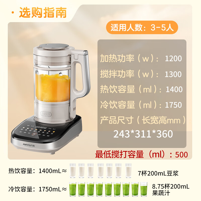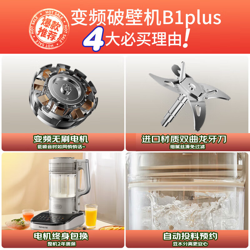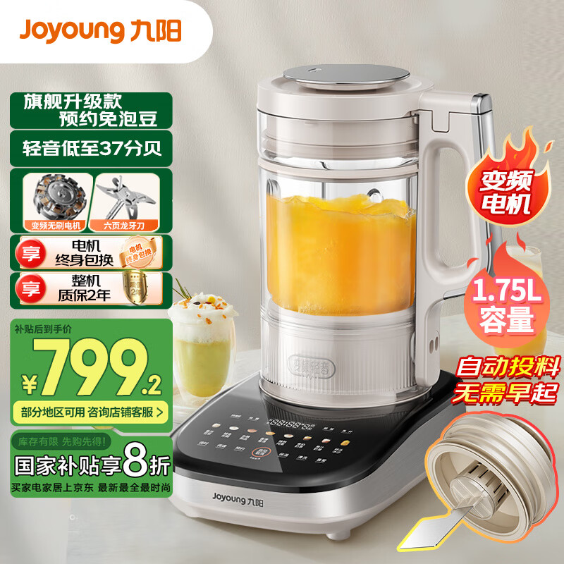 九阳(Joyoung)轻音破壁家用全自动榨汁机豆浆机料理1.75L大容量口感可调降噪变频轻音彩屏B1plus【补贴】价格:999.00元!