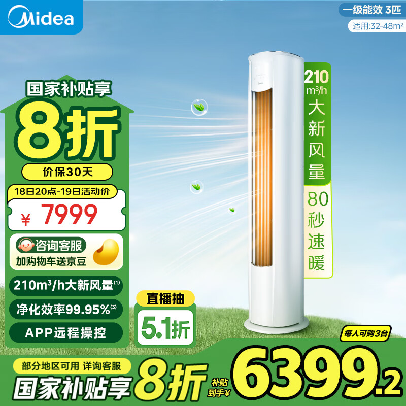 美的(Midea)3匹 新风空调 立式柜机 新风量 焕新风 新一级变频 节能 以旧换新 补贴 KFR-72LW/N8MKA1A价格:7999.00元!