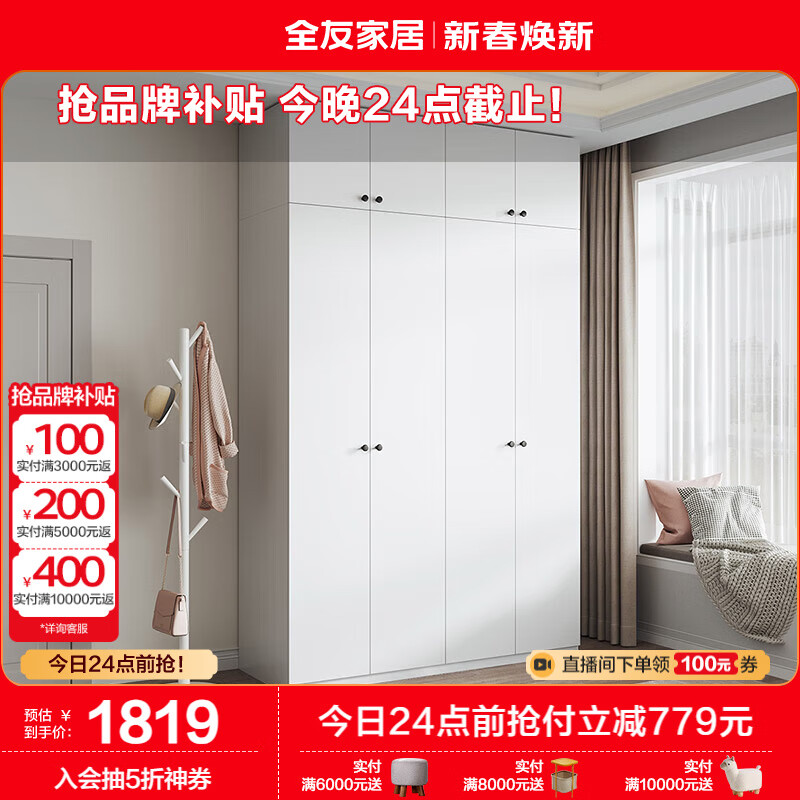 全友家居 衣柜现代简约卧室家用衣橱储物收纳挂衣柜顶柜组合DG10009价格:2598.57元!
