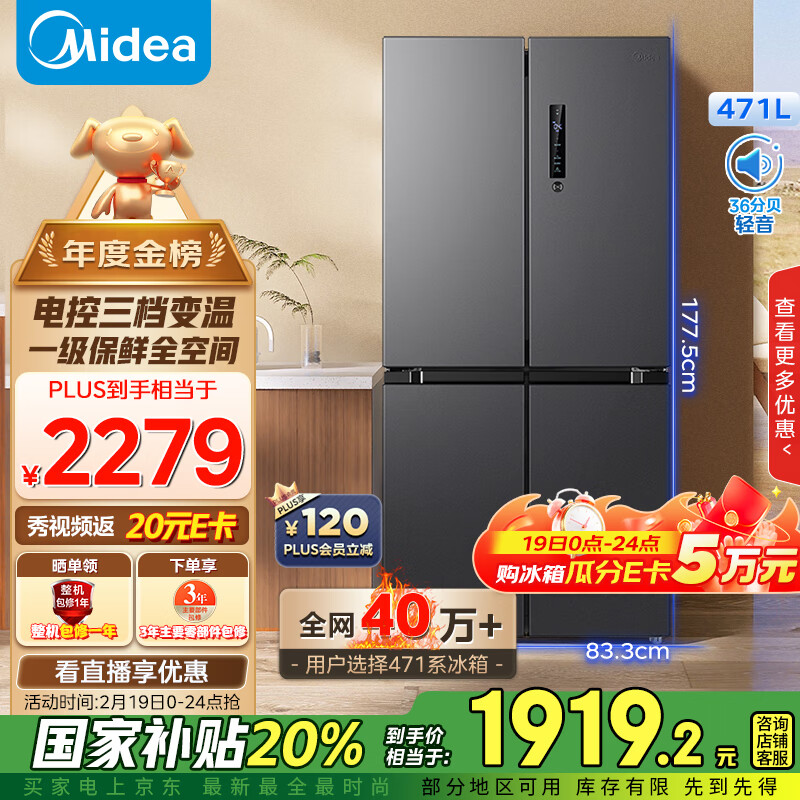 美的(Midea)471升十字对开四开门电冰箱家用风冷无霜一级能效双变频补贴超薄超大容量BCD-471WSPZM(E)价格:2398.99元!