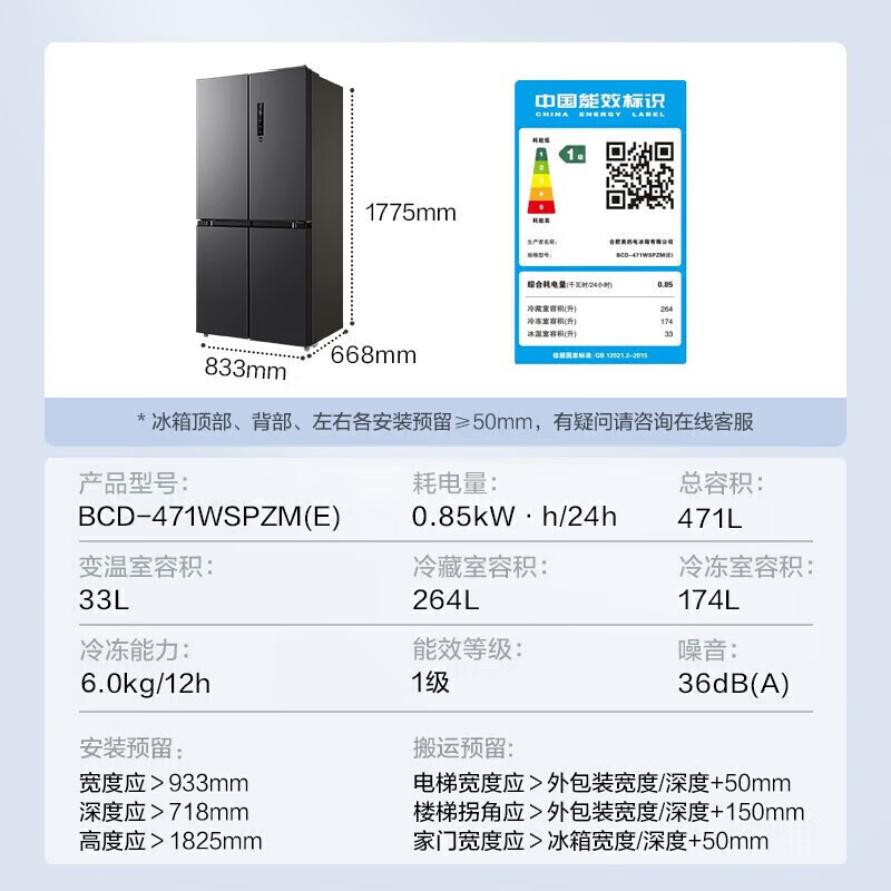 4、配送速度嘎嘎的快呀昨天下单今天中午就到了师傅很负责很贴心帮忙搬到厨房特地提醒5,6个小时不要通电冰箱容量也不错刚需471L大容量考虑到之后生小孩了母乳存放的位置冷藏的密封空间就很不错目前还没通电使用后期再追评冰箱值得入手性价比很高美的也是老品牌了!推荐推荐