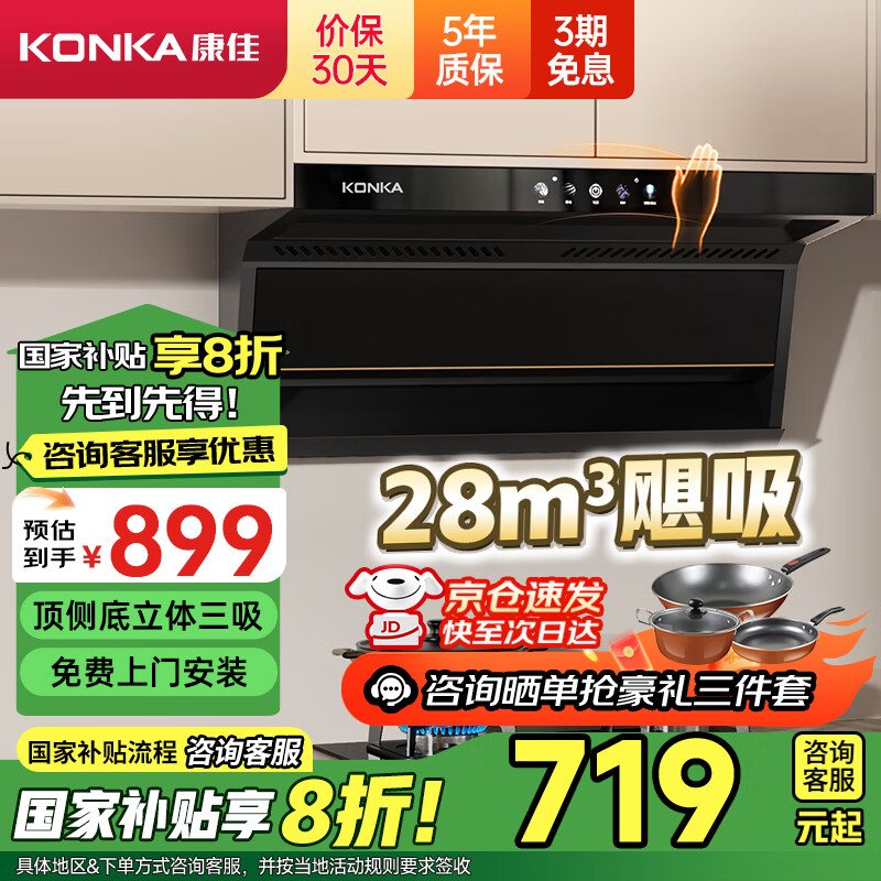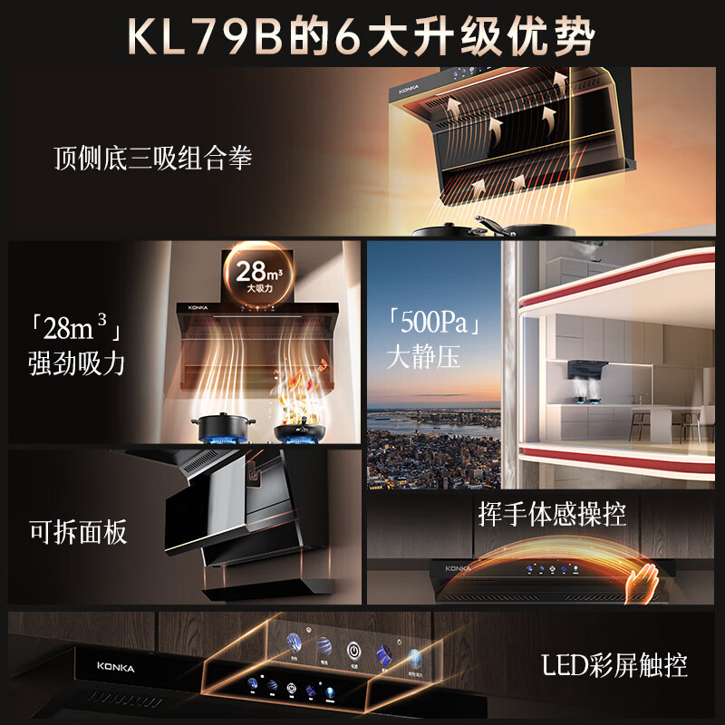 康佳(KONKA)顶侧双吸抽油烟机7字型 28立方爆炒大吸力补贴 宽屏拢烟 彩屏挥手智控 自清洗 CXW-288-KL79B价格:898.00元!