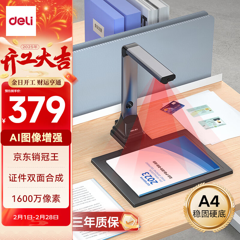 得力扫描仪 1600万像素高拍仪 照片扫描仪 扫描仪自动连续 高速办公用 金属机身 A4硬底15160价格:419.00元!