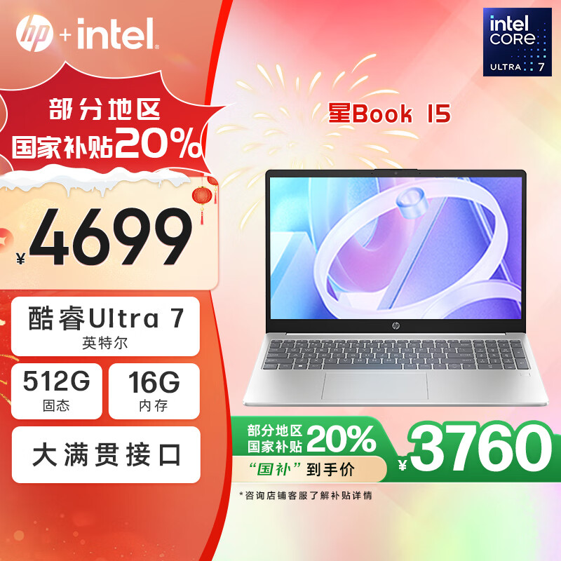 惠普HP【补贴20%】星Book 15 2024 15.6英寸大屏轻薄笔记本电脑(酷睿Ultra7 155H 16G 512G AI)银价格:4699.00元!