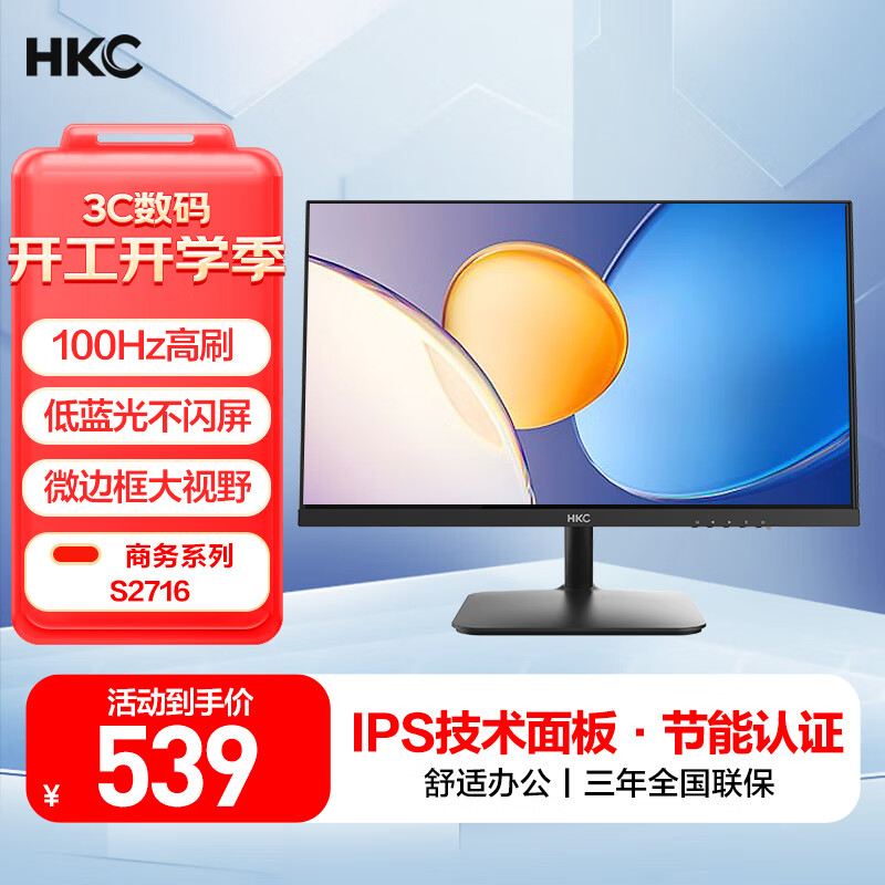 HKC 27英寸 IPS面板 100Hz高清屏幕 低蓝光不闪屏 HDMI接口节能认证 办公电竞游戏电脑显示器 S2716价格:599.00元!
