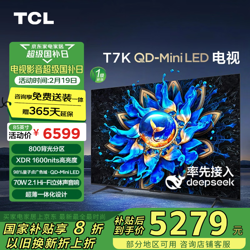 TCL电视 85T7K 85英寸 QD-Mini LED 800分区 XDR 1600nits QLED量子点 DeepSeek AI电视 补贴20%价格:6599.00元!