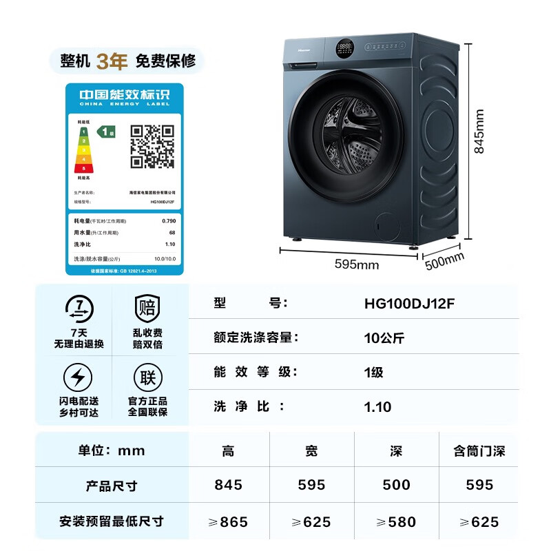 真的要说海信HG100DJ12F很喜欢这个外观,质量挺好的,洗衣机非常好,声音小,很稳不晃,安装师傅很有耐心,教我如何使用,赞一个。主要是卫生间太小,只能买这个超薄的,没想到,太合适了,非常适合我的小户型卫生间,放进去正好给,出租屋买的,真的不会,经济实惠