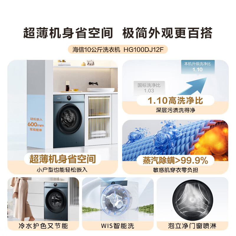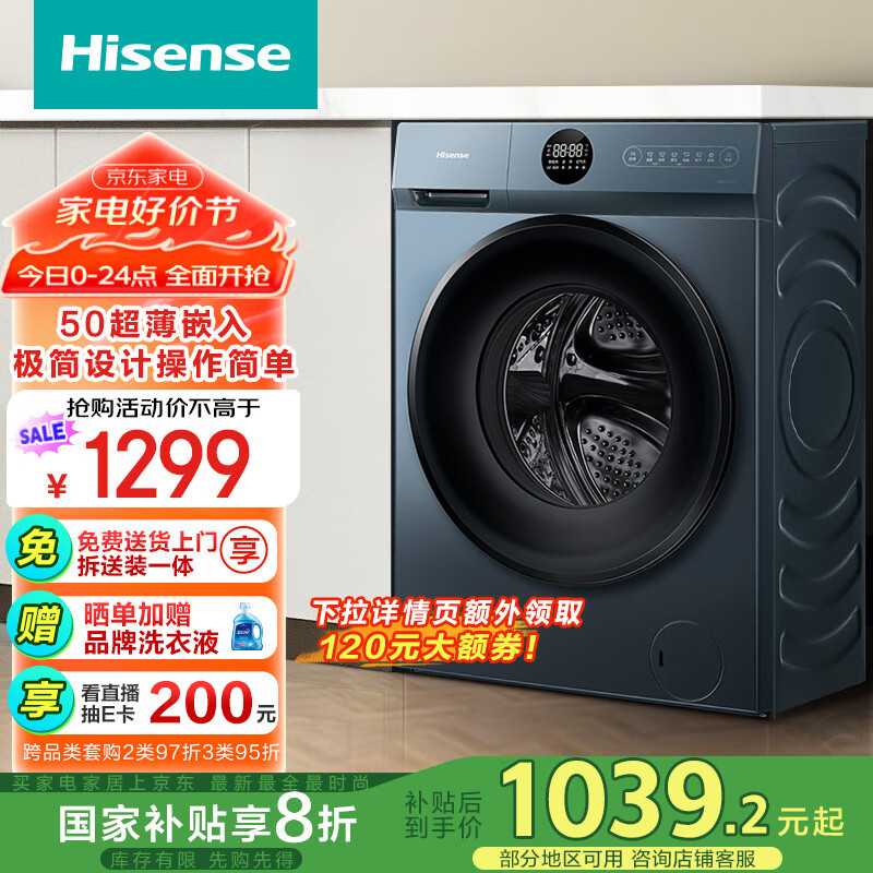 海信(Hisense)滚筒洗衣机全自动 10公斤家用大容量 超薄变频1.10高洗净比一级能效HG100DJ12F以旧换新补贴价格:1299.00元!