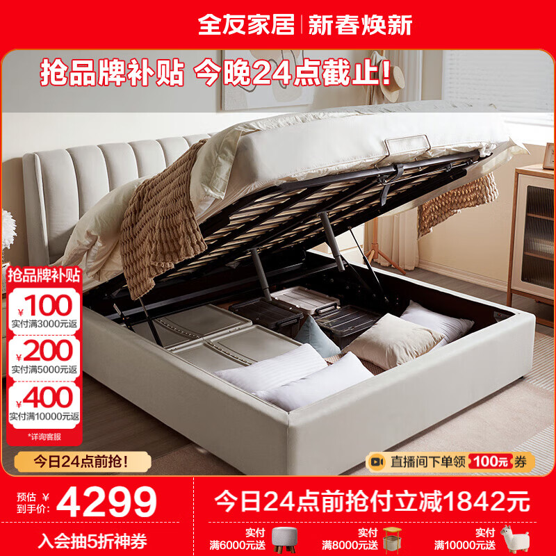 全友家居 床现代简约科技布床双人床卧室储物高箱床1.8米家具105207C价格:6141.43元!