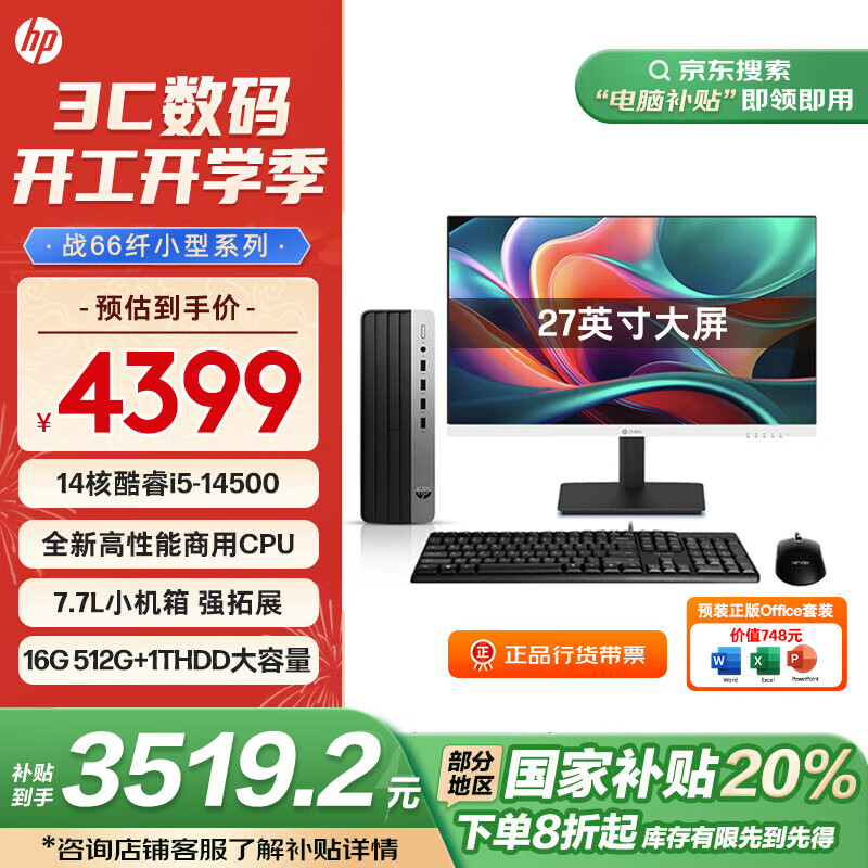 惠普 补贴 战66 台式电脑主机 (14代i5-14500 16G 512G+1T) 27英寸护眼大屏 办公学习机 生产力价格:4399.00元!