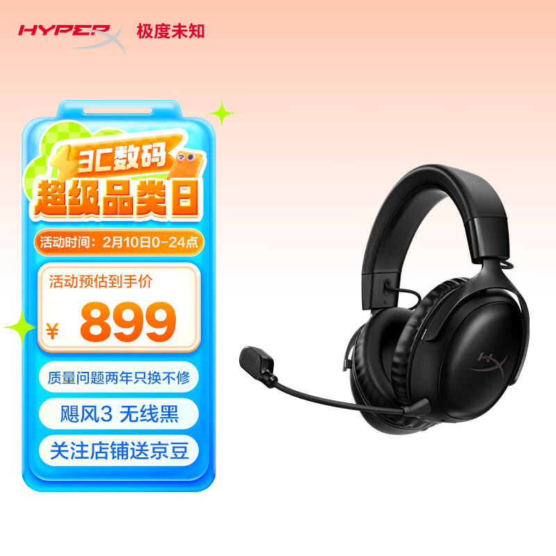 极度未知(HYPERX)【只换不修】Cloud Ⅲ Wireless 飓风3无线黑 电竞游戏耳机头戴式 降噪麦克风 FPS吃鸡价格:899.00元!