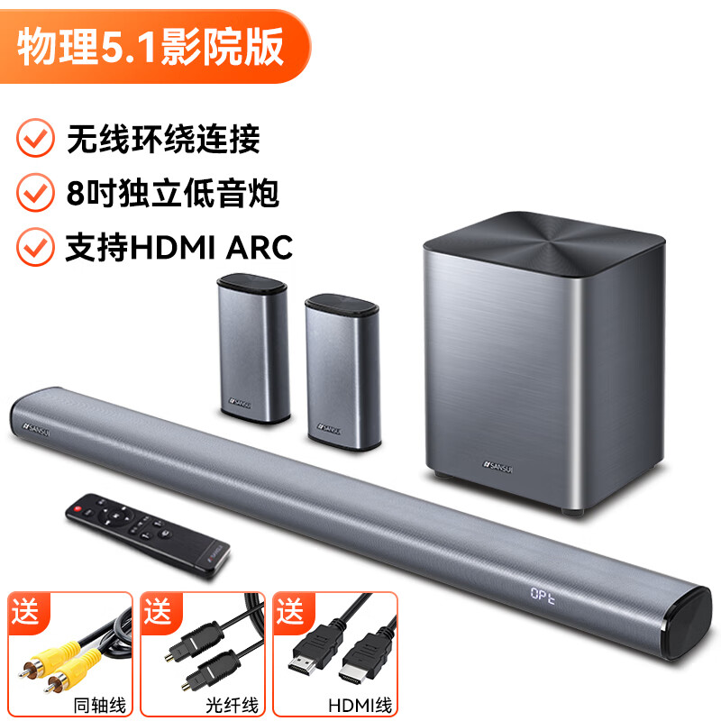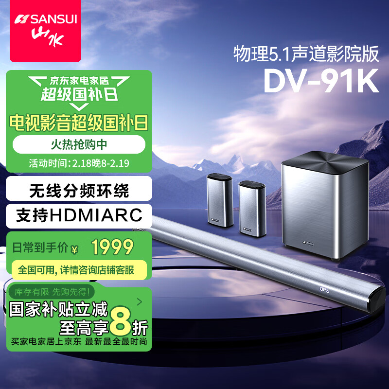山水(SANSUI)DV-91K回音壁 电视音响家庭影院 5.1声道套装无线3D环绕独立低音炮 家庭客厅壁挂智能蓝牙音箱价格:1999.00元!