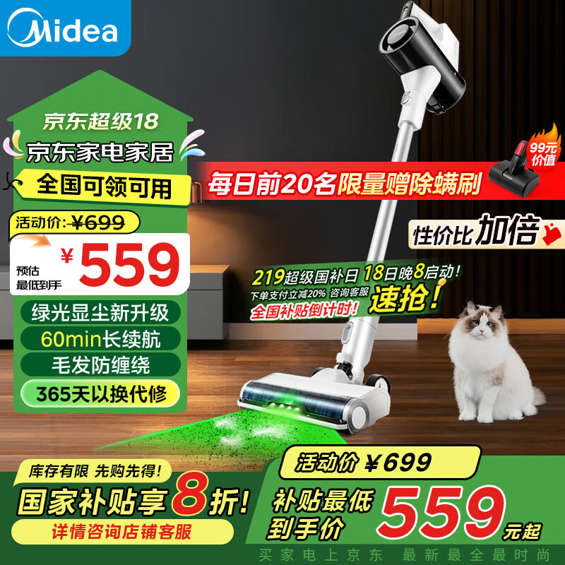 美的(Midea)吸尘器家用Q3 Green无线手持吸尘器 绿光显尘 除螨除尘车载轻量大吸力【补贴8折】价格:699.00元!