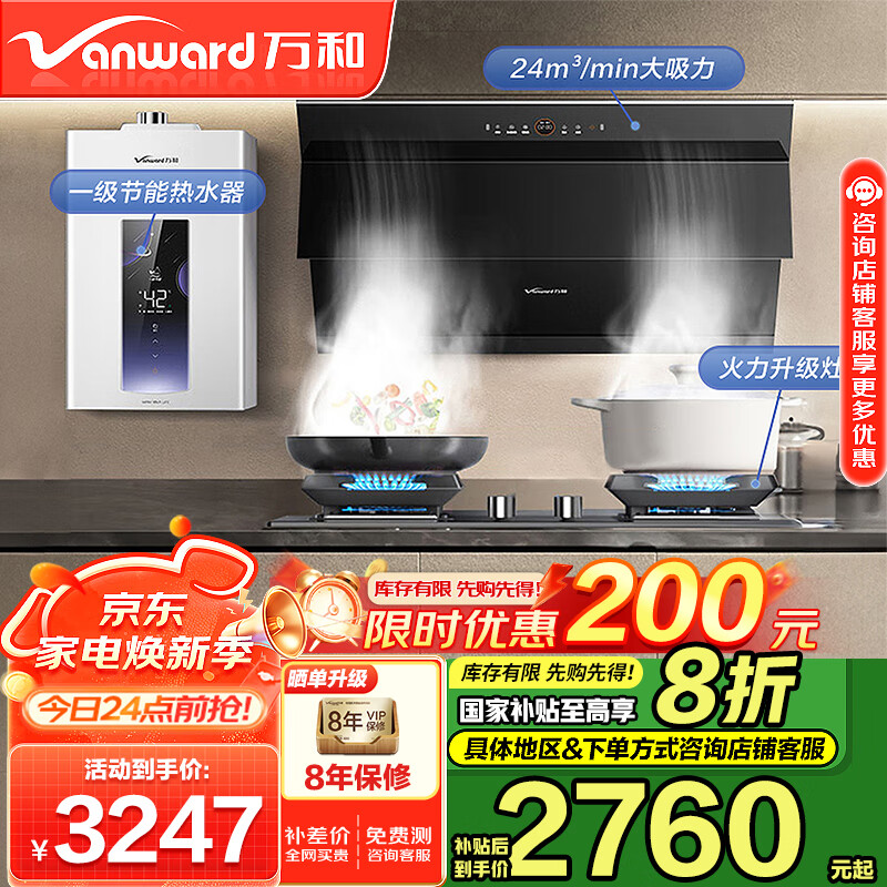 万和(Vanward)烟灶热三件套 24风量直流变频抽油烟机燃气灶具热水器套装 WJ920+C5L90S+ME5J16(天然气)价格:3347.00元!