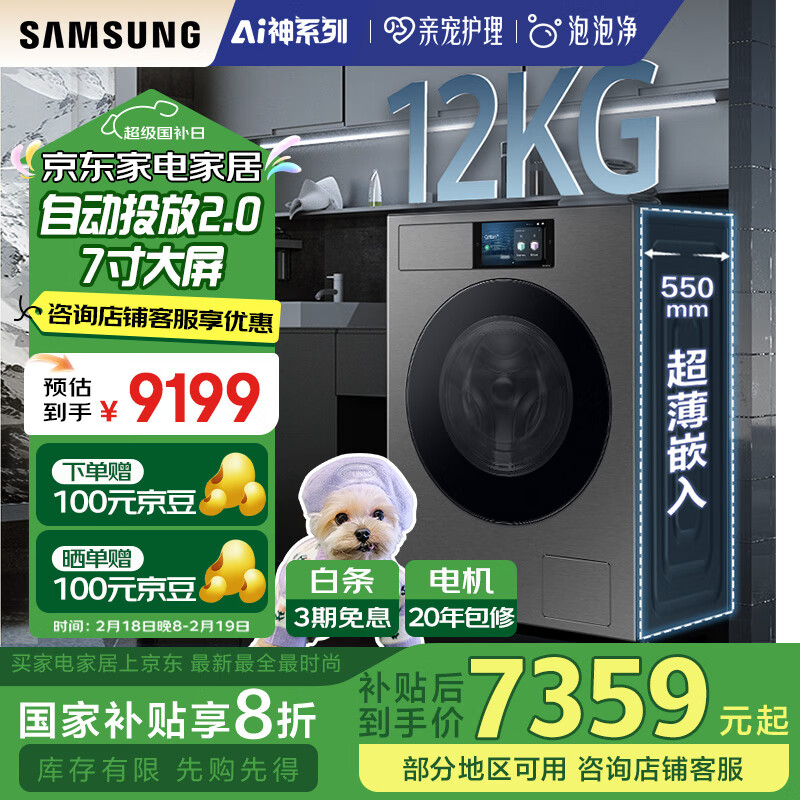 三星(SAMSUNG)AI神洗衣机9系 12KG全自动滚筒AI泡泡净亲宠衣物护理超薄嵌入以旧换新补贴黑WW12DB9B84GDSC价格:11499.00元!