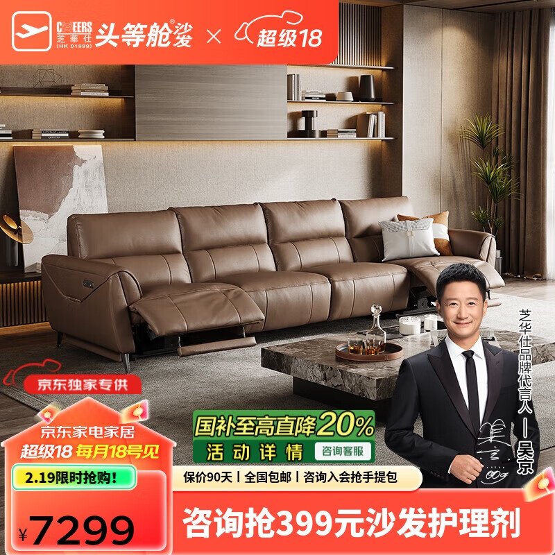 芝华仕(CHEERS)头等舱智能椅绅士皮沙发零靠墙功能直排客厅家具芝华士30268棕四价格:7299.00元!