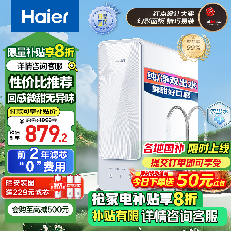 海尔(Haier)自然湃家用净水器400G净水机 RO反渗透厨下式直饮机净水器净饮机无双酚A母婴直饮双出水 HRO4H88价格:1099.00元!