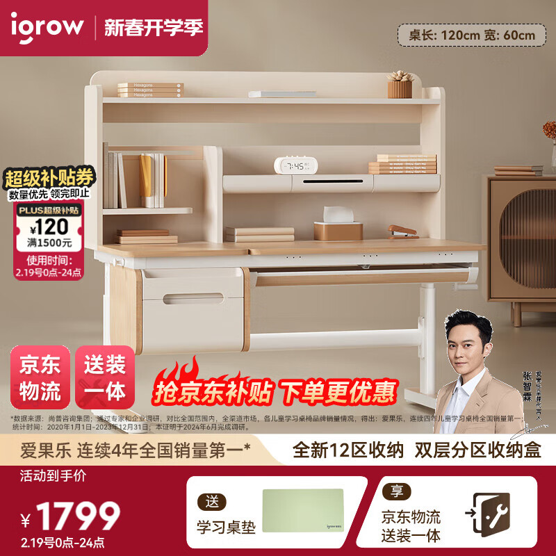 爱果乐(IGROW)咖啡猫儿童书桌学习桌椅写字桌【12分区收纳 奶油风配色】1.2m价格:2299.00元!