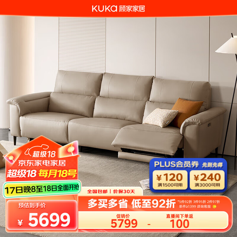 顾家家居零靠墙现代简约电动功能皮沙发客厅6196【燕麦色】三人位左电动价格:5799.00元!