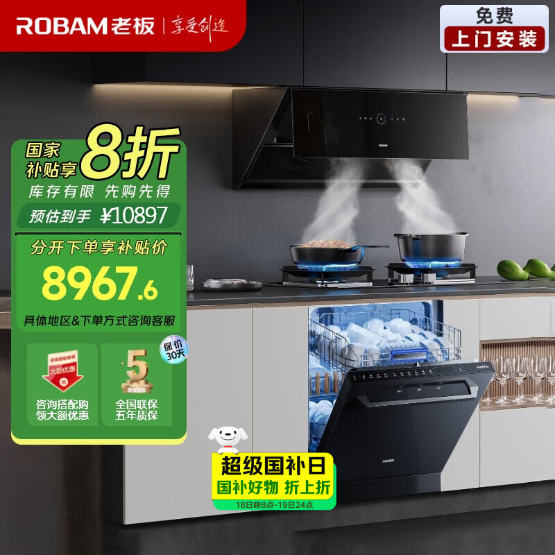 老板(Robam)灵犀全自动烟机26风量侧吸变频抽油烟机燃气灶灶具15套洗碗机厨房多件套 29A9S+57B6DT+F80D黑价格:10897.00元!