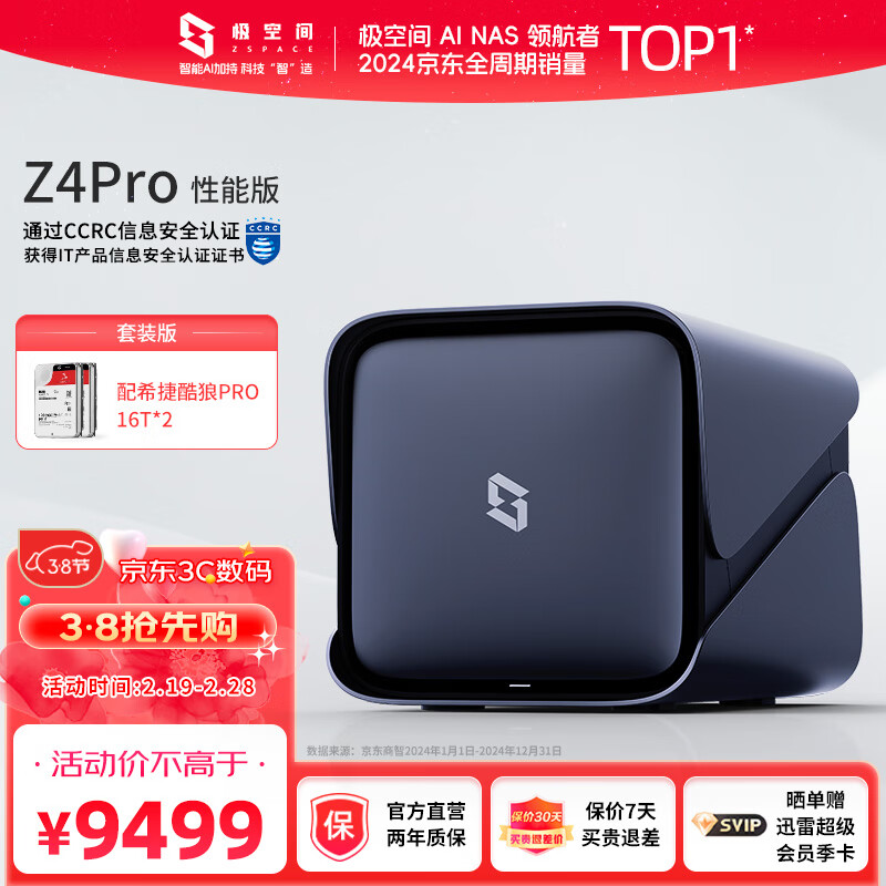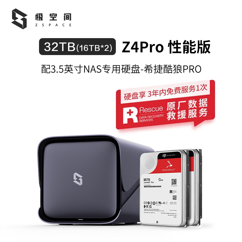 极空间私有云Z4Pro性能版8核16G内存 四盘位Nas家庭网络存储服务器 钛金灰 配2块16T希捷酷狼PRO价格:9999.00元!