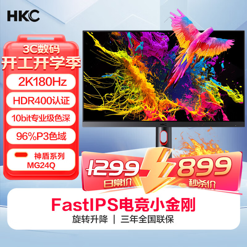 HKC 23.8英寸2K高清180Hz高刷FastIPS快速液晶10Bit广色域HDR400旋转升降电竞小金刚显示器神盾MG24Q价格:1099.00元!