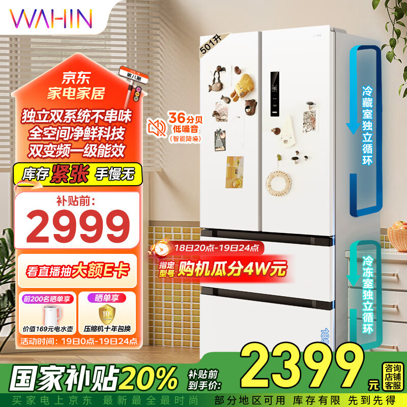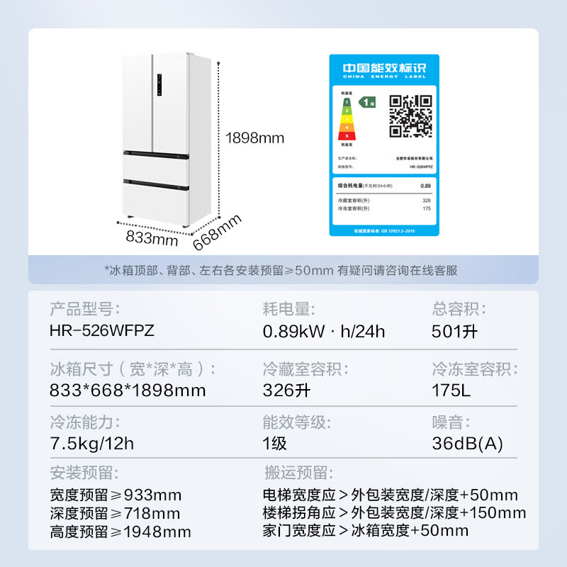 华凌526多门法式【508青春款】一级能效风冷全舱净味双循环大容量母婴冰箱HR-526WFPZ家电补贴20%价格:2999.00元!