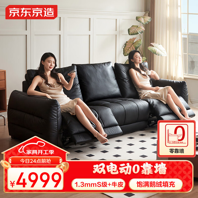 京东京造0靠墙大黑牛真皮电动沙发 头层牛皮双电动位鹅绒填充2.7米黑色价格:5499.00元!
