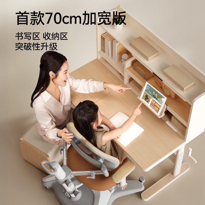 3、使用感受:分区明确,小朋友可以较好的归置自己的书本及学习用品,70cm宽的桌面比较大,可以放更多东西