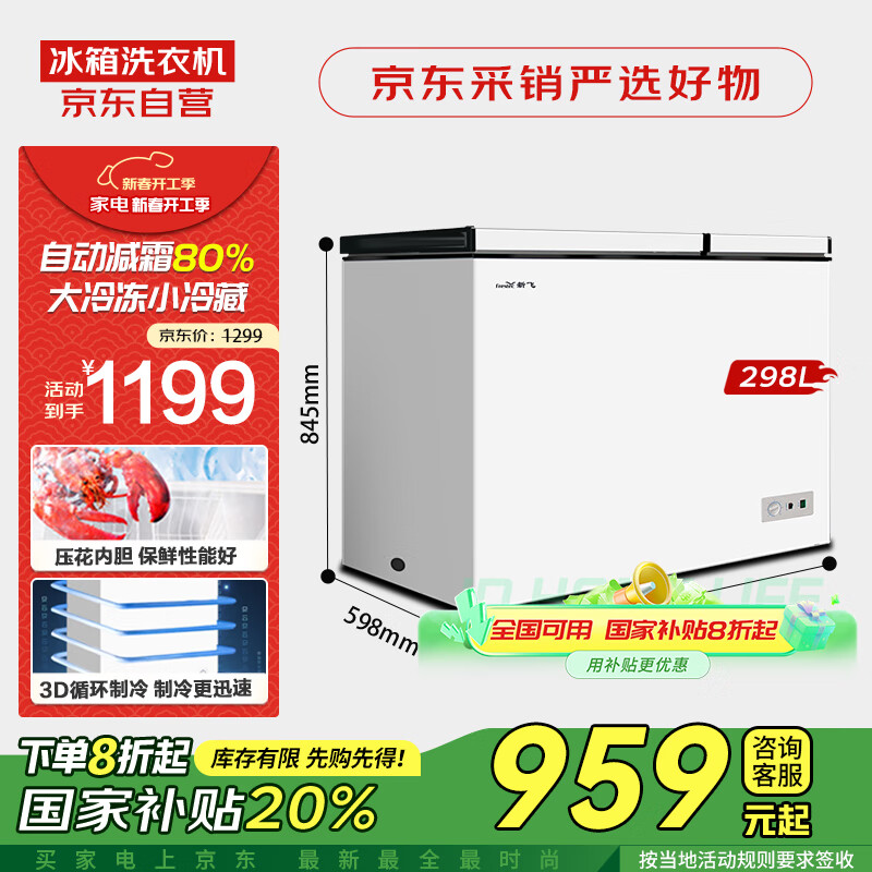 新飞(Frestec)298升减霜双温双箱冰柜 大冷冻小冷藏 卧式冰箱 大容积顶开门冷柜 BCD-298KAT价格:1199.00元!
