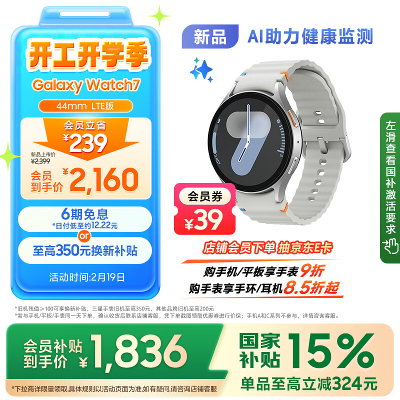 三星 Samsung【政府补贴】Watch7 智能手表/eSIM通话/运动手表/电话手表 44mm幻羽银 男女表价格:2199.00元!