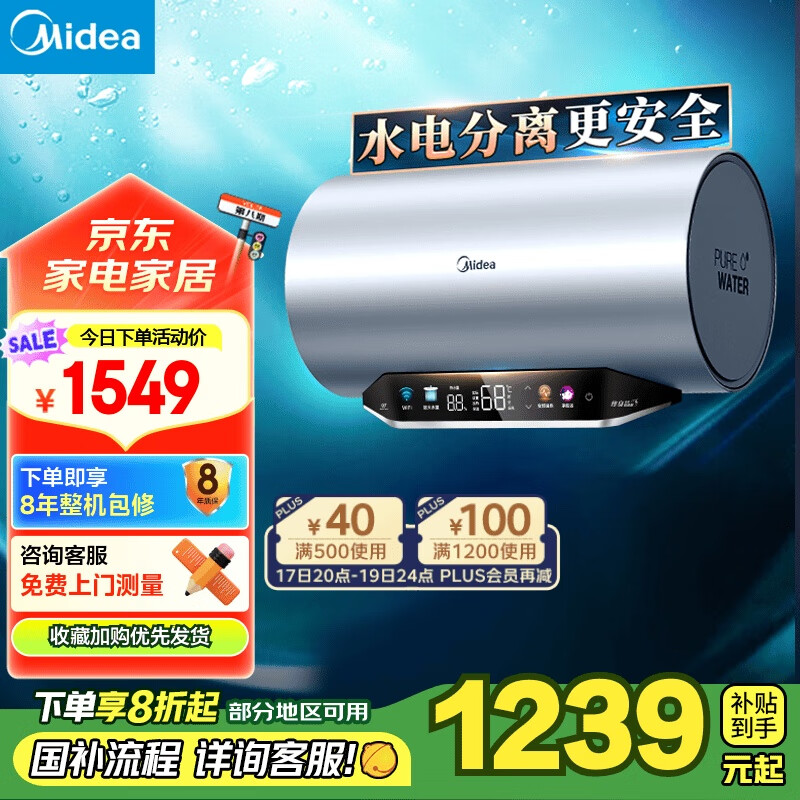 美的(Midea)水电分离60升电热水器家用 3300W变频 10重过滤净肤 瓷热舱内胆免清洗 以旧换新F6033-PE7pro(HE)价格:1549.00元!