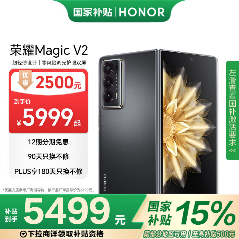 荣耀Magic V2 折叠屏 超轻薄设计 零风险调光护眼双屏 骁龙8Gen2版 16+512 绒黑色 5G AI智能手机价格:5999.00元!