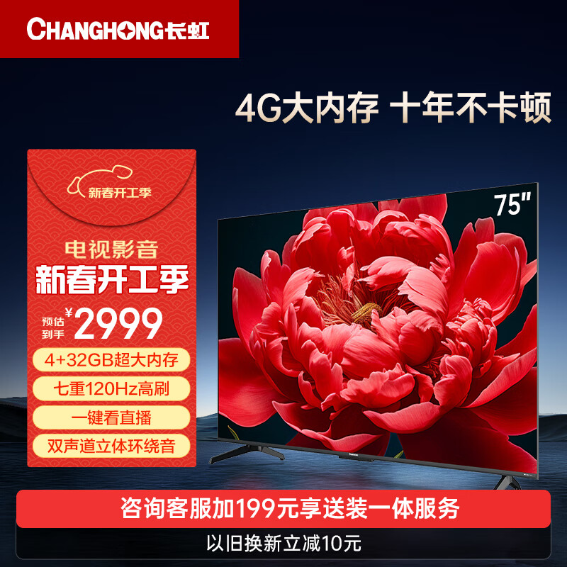 长虹电视75D66F 75英寸4K超高清 4+32GB超大内存 一键看电视 120Hz高刷新液晶电视机 以旧换新价格:2999.00元!