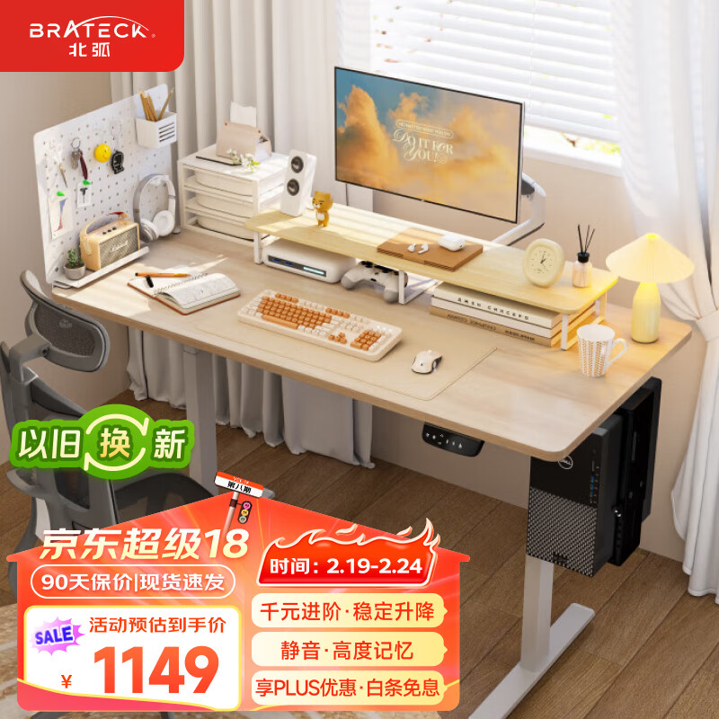 Brateck电动升降电脑桌 北弧站立办公升降书桌 工作升降台 K2黄1.5米价格:1999.00元!