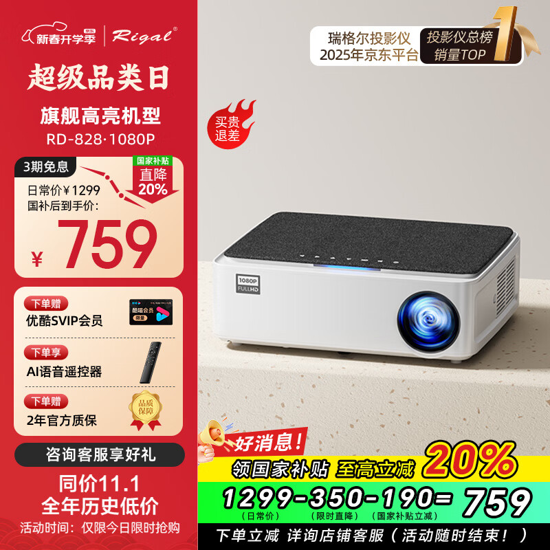 Rigal(瑞格尔)RD-828 投影仪家用办公投影机(1080P物理分辨率 AI语音智能 手机无线同屏)价格:949.00元!
