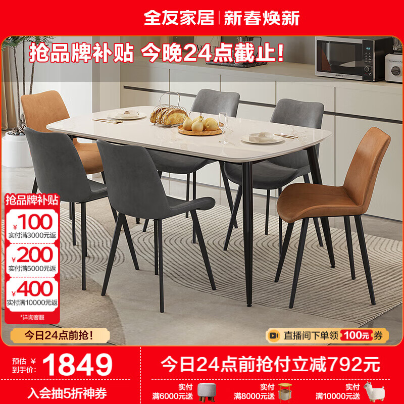 全友家居 岩板餐桌家用小户型长方形吃饭桌子简约餐桌餐椅组合DW1179价格:2641.43元!