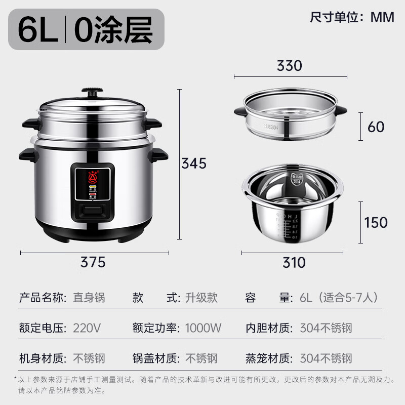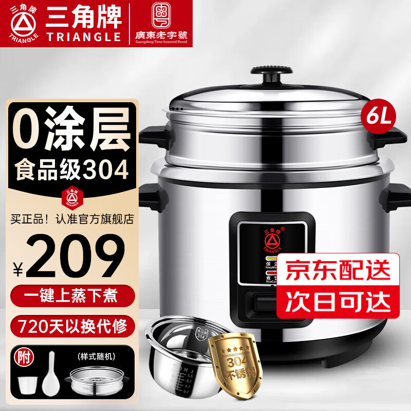三角牌(Triangle) 电饭煲 老式电饭锅不锈钢0涂层家用煮饭锅米饭锅带蒸笼家庭2-3-4-5-6人1用无涂层内胆 升级304内胆【0涂层】 6L价格:209.00元!