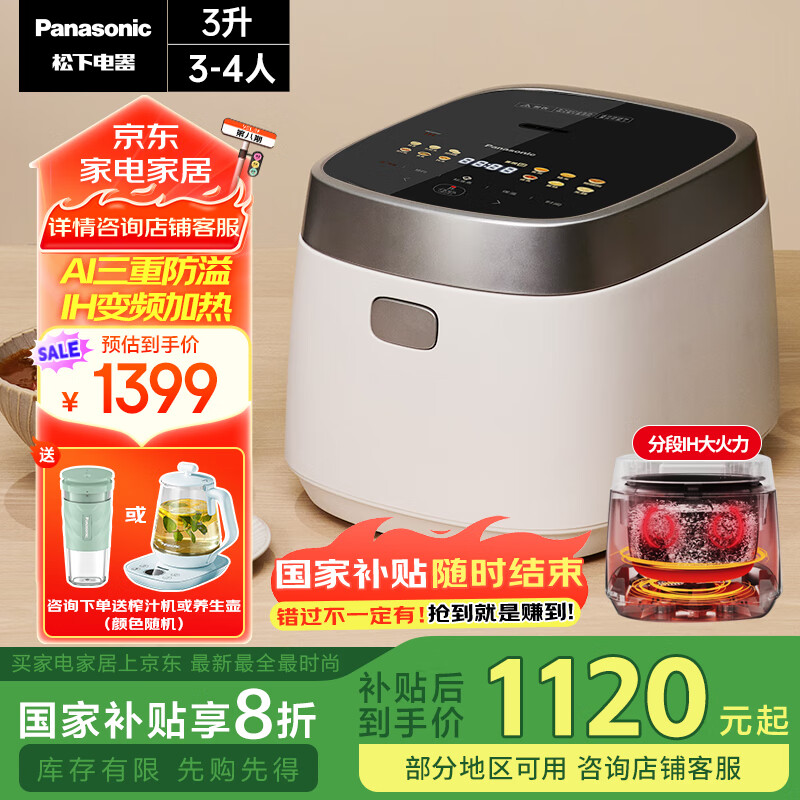 松下(Panasonic)饭光光电饭煲家用3-4人多功能IH煮饭锅智能预约备长炭内胆一级能效3升容量SR-H10NJ-W价格:1399.00元!