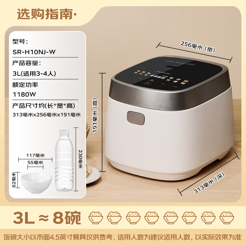 4、松下(Panasonic)饭光光电饭煲3L家用3-4个人多功能电饭锅智能AI三重防溢备长炭内胆IH分段加热SR-H10NJ-W外形外观:外观整洁大方,档次上来了内胆容量:3升容量。功能配置:智能防溢很省心操作难易:操作简单方便