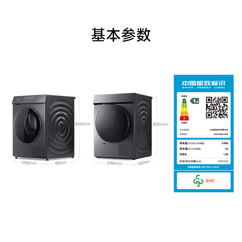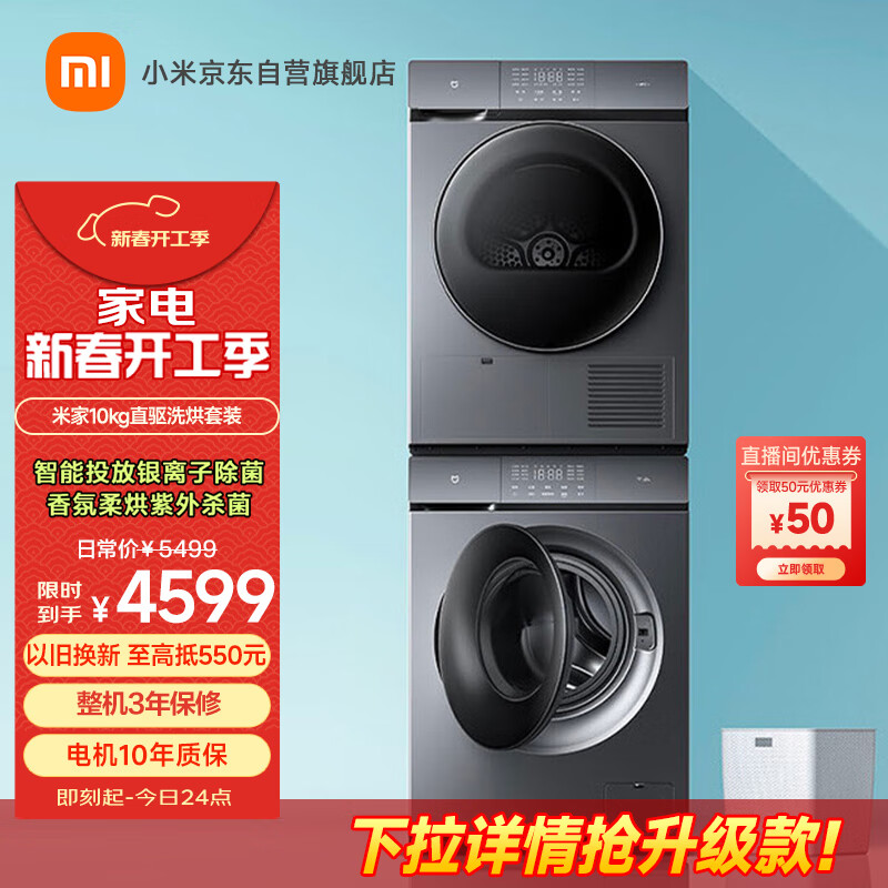 米家小米出品 洗烘套装10kg滚筒洗衣机全自动+10kg热泵烘干机 直驱变频XQG100MJ102S+H100MJ102S价格:4599.00元!