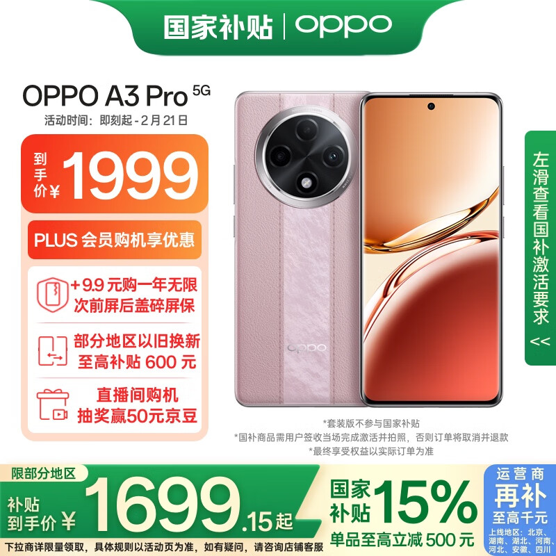 OPPO A3 Pro 12GB+256GB 云锦粉 5G 政府补贴 耐用战神 满级防水 360°抗摔 超抗摔护眼屏 智能AI手机价格:1999.00元!